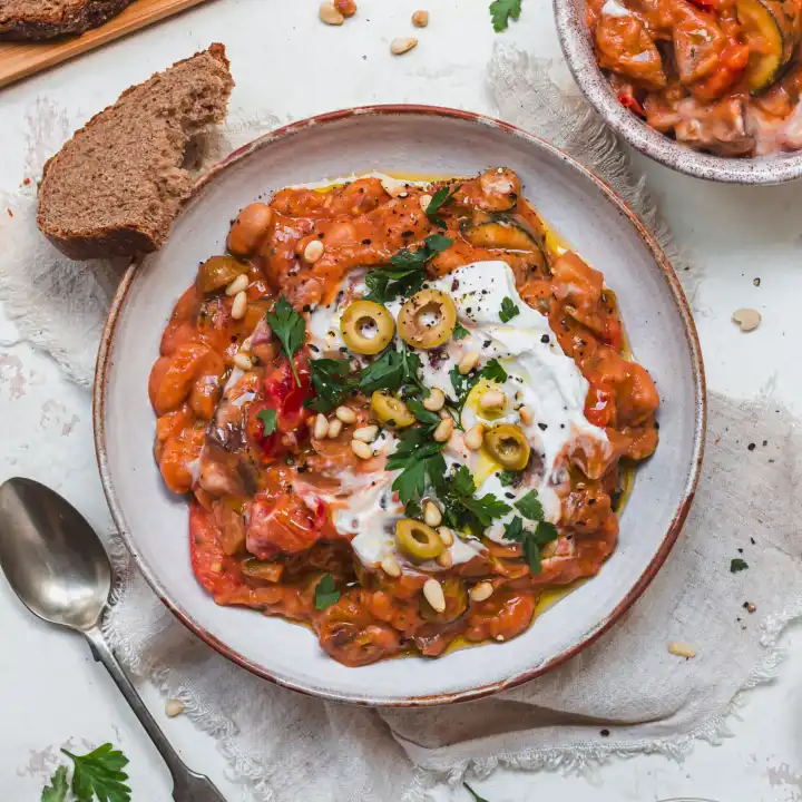 Eggplant caponata with capers, olives, tomatoes served over pearl barley