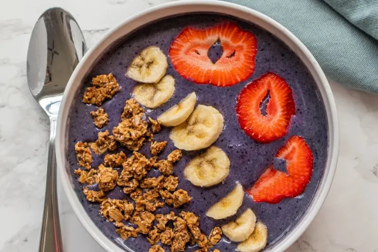 Spinach-banana smoothie bowl with chia, blueberries, and slivered almonds