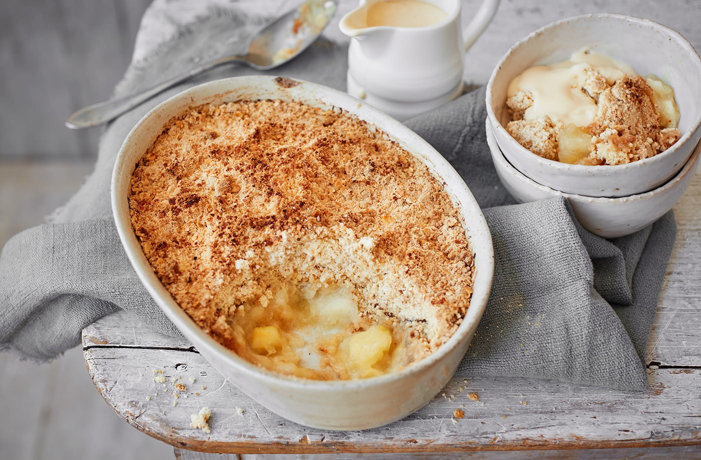Mix filling ingredients and place in a greased baking dish. Mix crumble topping and sprinkle over apples. Bake at 180°C (350°F) for 35–40 minutes until golden.