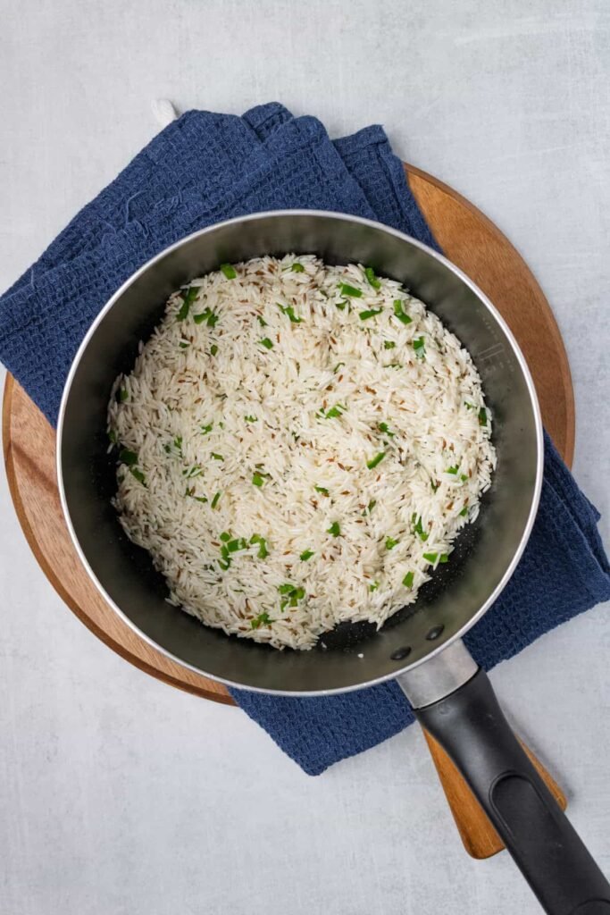 Do not stir the rice too much after it is cooked — fluff it lightly with a fork to prevent breaking the grains.