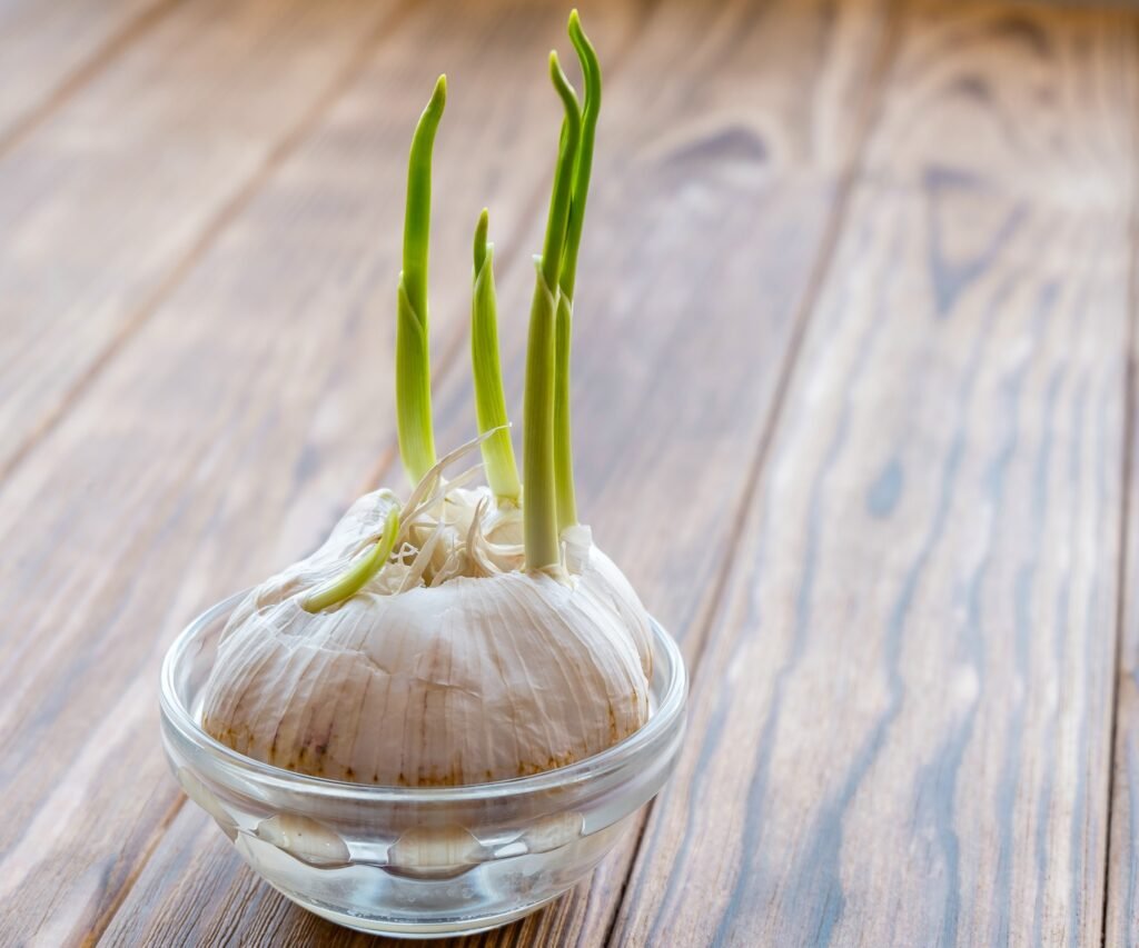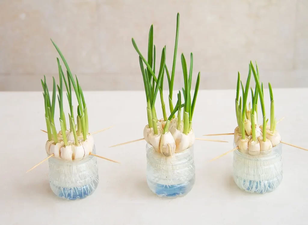 Garlic can grow in water alone, producing roots and shoots before transplanting or even fully maturing.